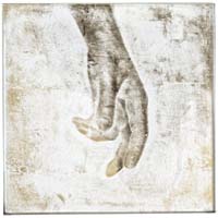 Hands are extremely private parts of the human body, yet at the same time our most public. They embody our innermost personality and yet are the first extension into the world, like branches of our innards reaching out. With our hands we do the most intimate things- both creative and destructive. We make love, we caress, hold, shape, reach, carry, build, and we also slap, hit, push, punch, destroy. Out of love and necessity we prepare food, and wash our private and communal intimate bodies. We know our loved one’s hands as clearly as our own. Somehow, in the depiction of hands, from hands inspired by medieval paintings to the hands of the people I most love, I get close to the ephemeral spirit of a person, the almost thereness of them. The use of dark graphite and glass pushes the sense of the fleeting nature of things, how fragile and yet tensile is our knowing and loving one another. Emerging from darkness in the graphite, ephemerally there in glass, hands reflect this fragile knowing, so mysterious we can see it only sideways, in glimmers, darkness and reflection.