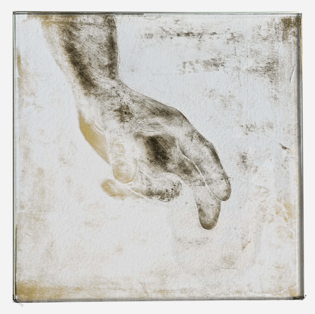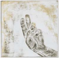 These works are an ongoing expanding series using drawings of hands of people close to me. They are 22k gold leaf on glass in an adapted verré eglomisé technique. |